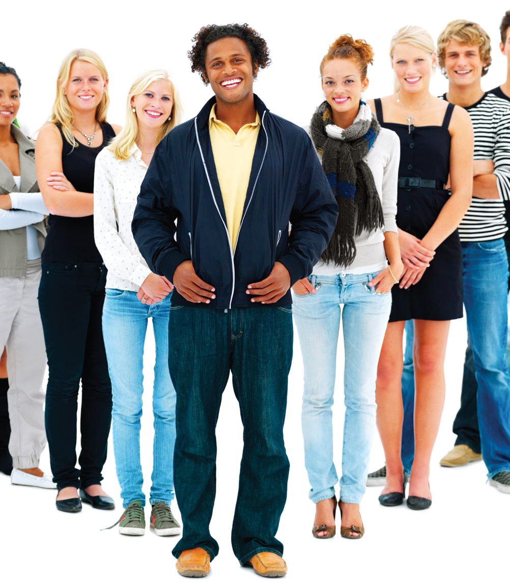 Group of smiling friends standing against white background