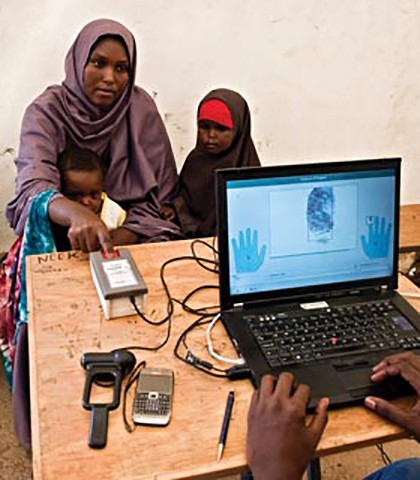 Image description: A mother registers by giving her thumbprint at Dabaab refugee camp. Since Al Shabaab, an Islamic militia with alleged links to Al Qaida, is controlling large parts of Somalia and imposing tough Sharia laws, many civilians are fleeing to neighbouring Kenya.